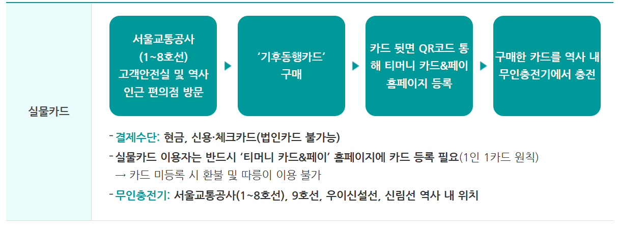 🔸충전: 실물 카드는 서울 지하철역 내 무인 충전기에서만 충전이 가능하며, 편의점이나 ATM에서는 충전할 수 없습니다.