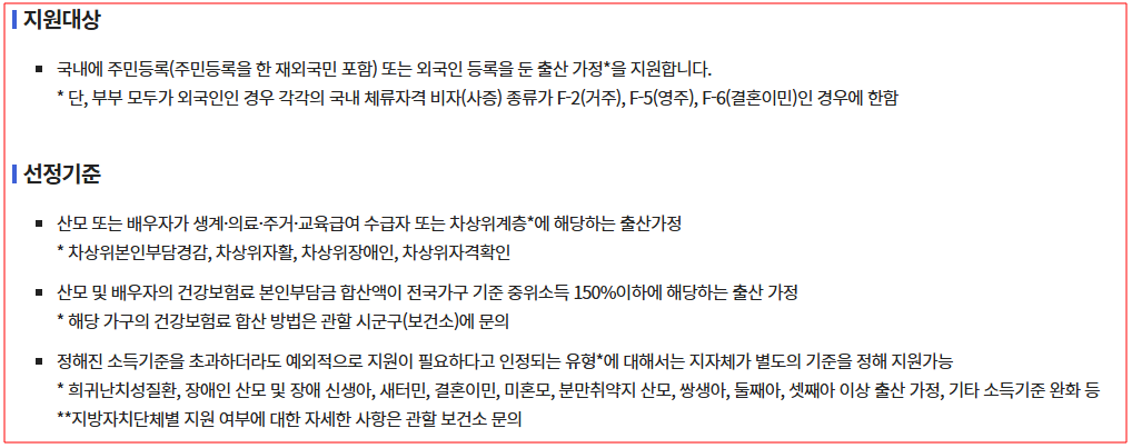 ◾ 산모 또는 배우자가 생계, 의료, 주거, 교육급여 수급자 또는 차상위계층일 경우 우선 지원