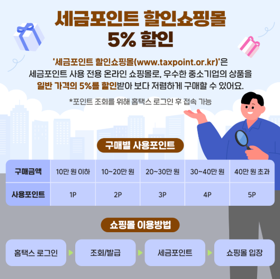 ◾ 세금 할인 쇼핑몰 이용 : 세금포인트를 사용하여 쇼핑 시 할인 혜택을 받을 수 있습니다.