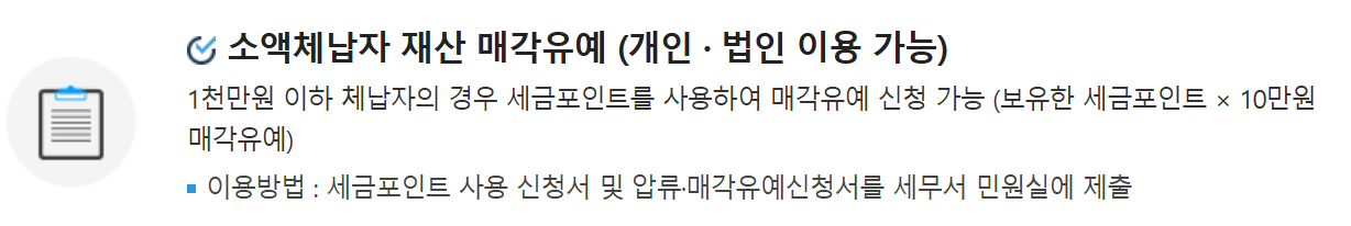 ◾ 소액 체납자 재산 매각 유예 : 소액 체납자의 경우, 세금포인트를 사용하여 재산 매각을 유예받을 수 있습니다.