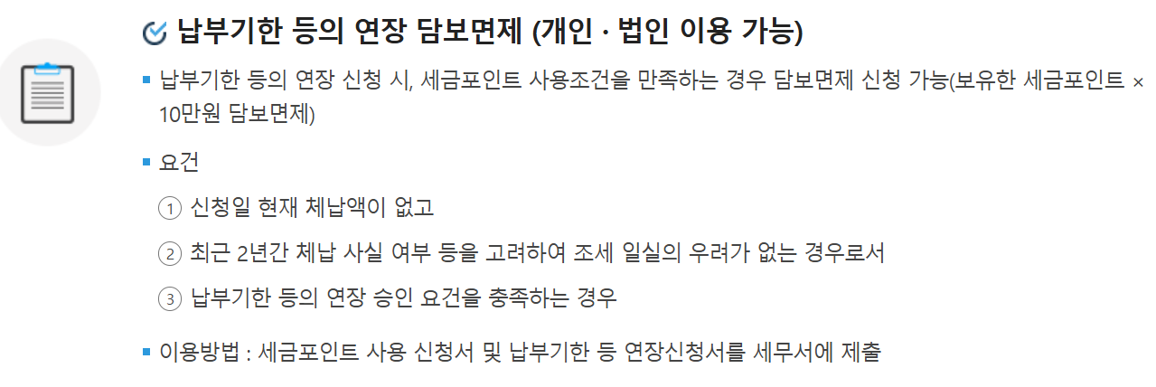 ◾ 납부기한 연장 : 세금포인트를 활용하여 납부기한을 연장할 수 있으며, 이 경우 담보 면제를 받을 수 있습니다.