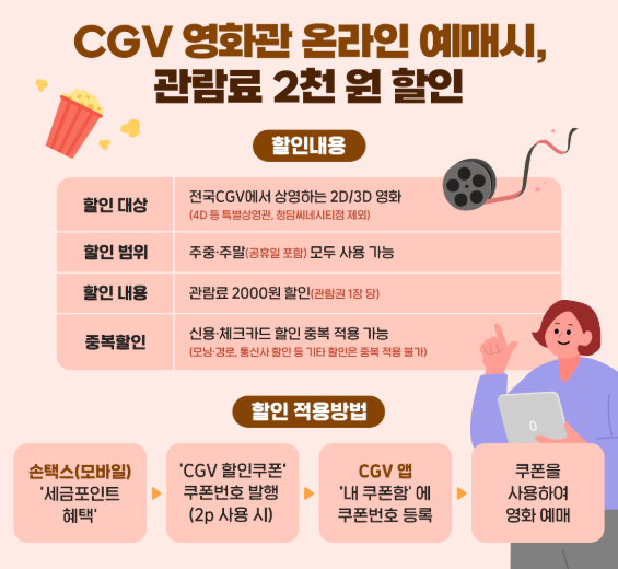◾ 영화표 할인: 전국 CGV 영화관 예매시 2포인트를 차감하고, 2000원 할인받아 예매가 가능합니다.