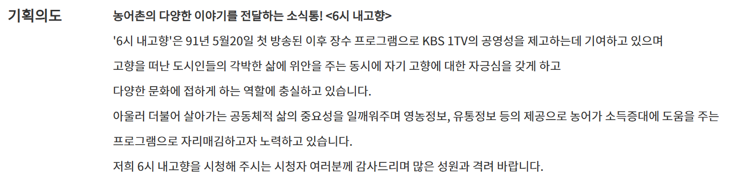 ‘6시 내고향’은 KBS에서 방영하는 대표적인 농어촌 교양 프로그램으로, 도시와 농촌 간의 상생과 교류를 목표로 하고 있습니다.